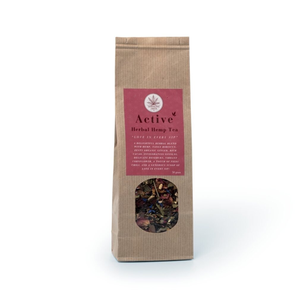 Active er en økologisk hampe te skabt til at give kroppen energi og sindet klarhed. Denne levende teblanding kombinerer hampe blade med friske urter, rødder og blomster for at skabe en naturlig energikilde uden koffein.